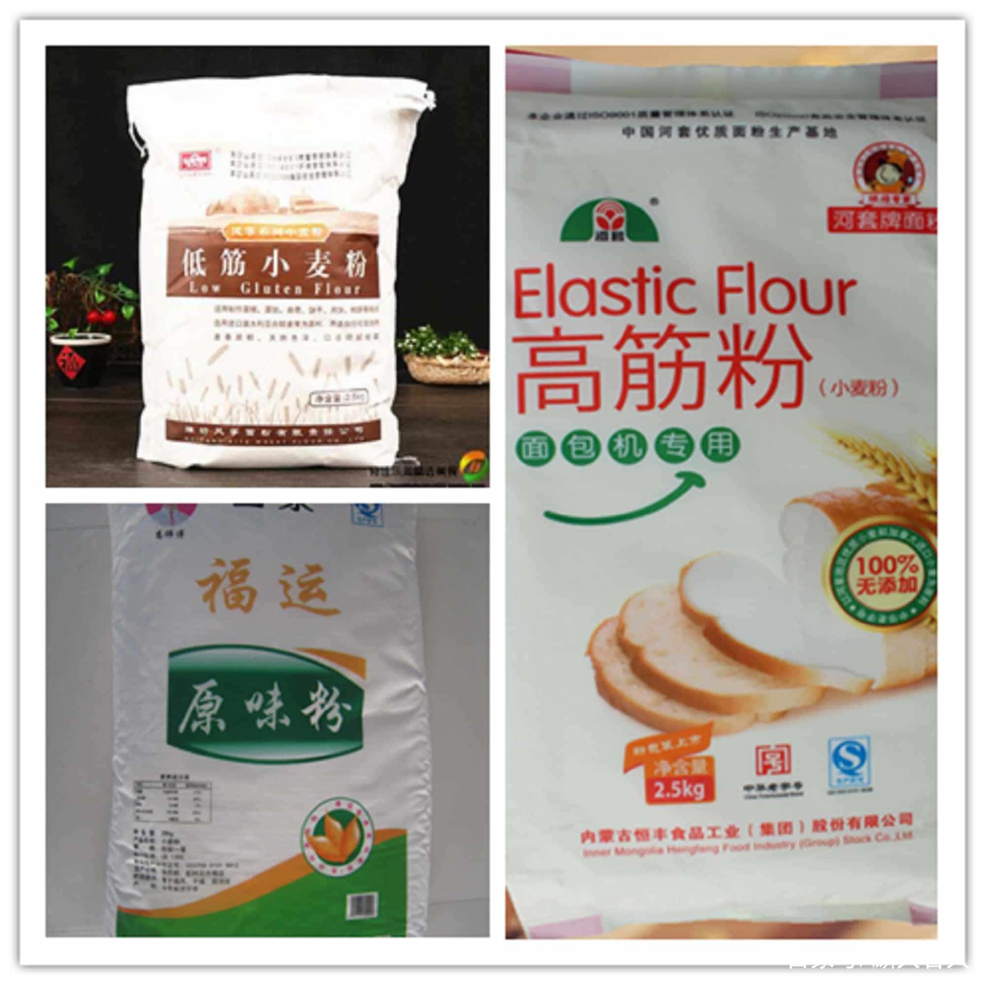 其实市面上的面粉一般可根据筋度分为:低筋面粉、中筋面粉、高筋面粉这三种。而不同筋度的面粉在使用范围上又并不相同,比如低筋面粉筋度最低,适合制作一些不需要弹性的食物,如蛋糕、饼干、派皮等;而中筋面粉筋度适中,适合制作口感松软又不缺弹性的食物,如包子、馒头、饺子皮、面粉袋订做厂家电话/微信:15838231350油条等食物,而高筋面粉的筋度最高,弹性最大,所以适合制作口感筋道饱满的食物,比如面包、刀削面等美食。