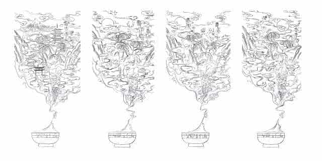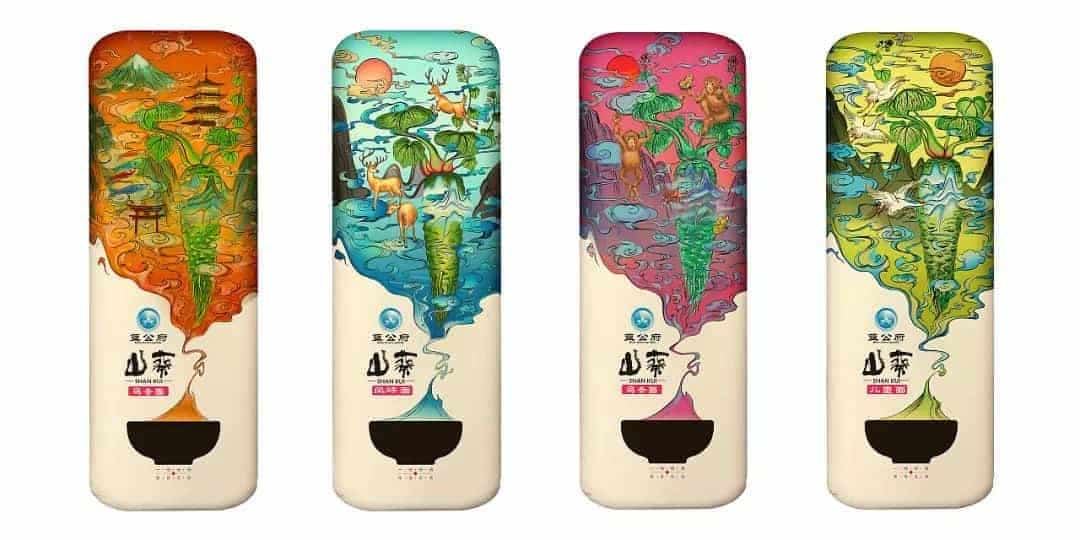 包装风格是浓浓的中式插画风。猴子,麋鹿,塔等富有中国特色的元素被应用到插画中,充满灵气,有种神话传说的味道。