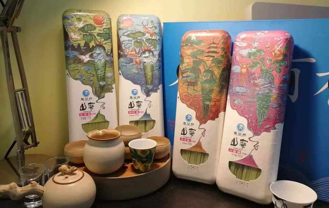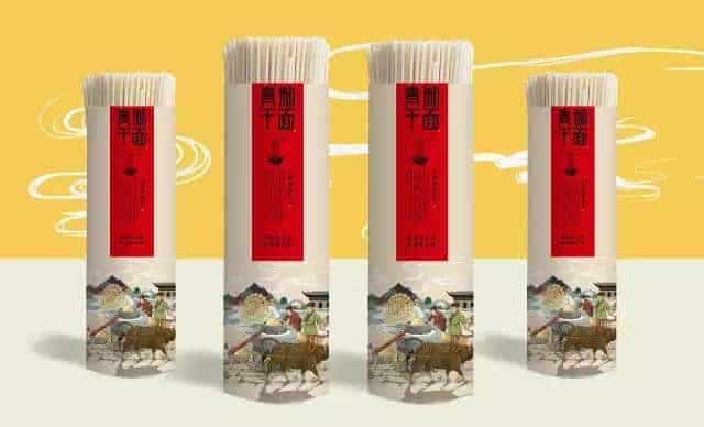 青城干面的包装展示了一幅农耕景象,勤劳的农夫,远处的山城景色,很有地方特色。