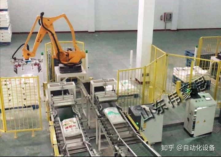 面粉包装码垛生产线自动上袋、开袋、夹袋、填充、移动输出、自动缝合、喷码、输送、倒袋整形机 、金属检测机、重量复检机、剔除、垛盘输送、机械手码垛、缠绕、AGV小车等组成,能全自动完成上袋,供袋,自动称重包装,输送,封口,码垛,运往仓库的整套自动化设备。
