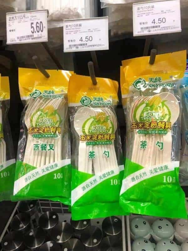 货架上的一次性餐具也被玉米淀粉餐具取代