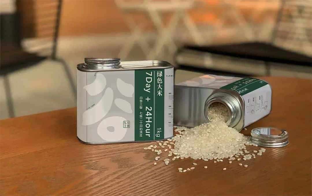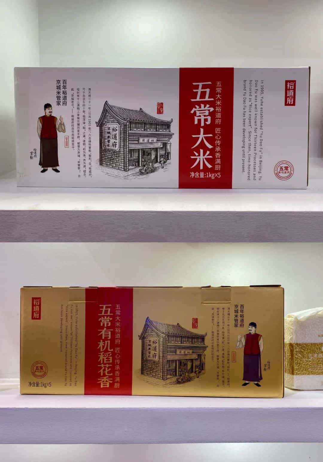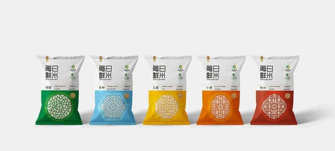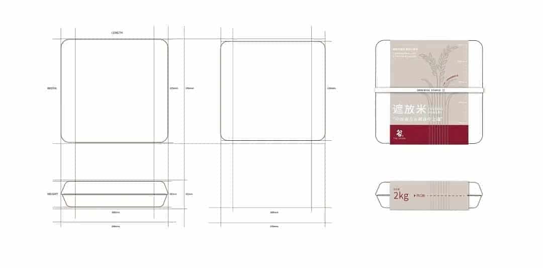 在盒型结构、风格都有所不同的大米包装
