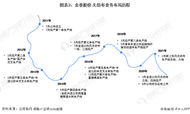 2011年7月,金春股份成立;同年7月,金春股份第一条无纺布生产线正式投产。2014年,引进全欧洲进口双梳理直铺高速水刺生产线,为当时中国国内技术配置最先进,产能最高的水刺直铺线,创造国内高速高产但产品质量未下降的先例。2017年,公司全进口热风无纺布一线、二线投产,扩展热风无纺布业务。2018年,公司首条半进口长丝超细纤维非织造布生产线投产,在细分领域迈出重要一步。2020年8月,公司成功在创业板上市。