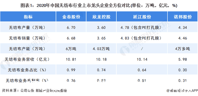 无纺布(又称非织造布)是一种新型环保材料,广泛应用于农业、家用装饰、工业、军用、汽车行业、学校、办公用品、卫生保健、休闲、旅行、服装、土工布、居家用、个人卫生用品、建筑业等行业。目前,中国无纺布市场竞争激烈,市场的参与者众多,其中金春股份、欣龙控股、延江股份、诺邦股份为中国无纺布上市龙头企业。