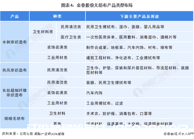 目前,金春股份无纺布产品主要为水刺、热风、超细纤维、熔喷四大类。其中水刺非织造布材料主要应用于卫生材料类(含民用清洁类、医疗卫生类)、装饰装潢类、工业用材类三大领域;热风非织造布主要应用于民用清洁类领域;长丝超细纤维非织造布主要应用于民用清洁类、装饰装潢类、工业用材类三大领域;熔喷非织造布主要用于卫生材料、过滤、保温用材料等领域。