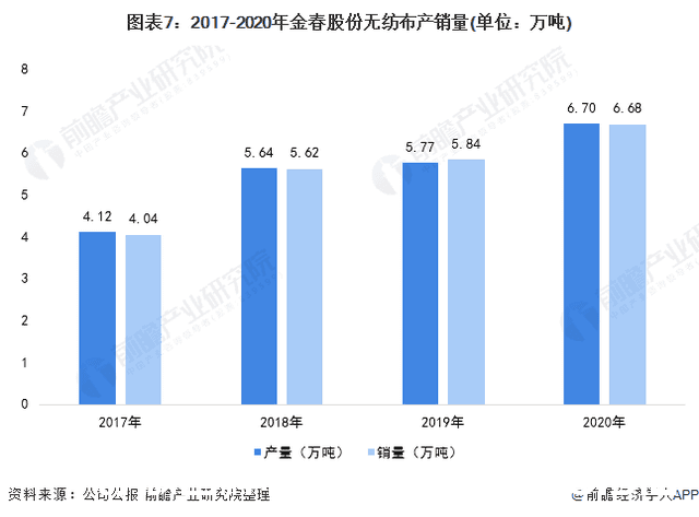 2017-2020年,金春股份无纺布产销量均呈现增长态势。公司无纺布产量从2017年的4.12万吨增长至2020年的6.70万吨,销量从2017年的4.04万吨增长至2020年的6.68万吨。