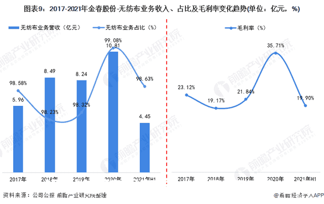 从无纺布业务的经营情况来看,2017-2020年,金春股份的无纺布业务收入稳步增长,占总营业收入的比重保持相对稳定。2020年,公司无纺布业务营收达10.81亿元,占总营收的99.08%。