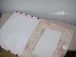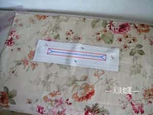 ▼10.拿做内贴袋的棉布38*18cm一片,把它缝在另外一片里布上:如图红色线,中间压线,变成一大一小两个贴袋: