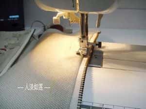 ▼15.把长拉链缝在里布上面,注意拉链背面与里布正面相对: