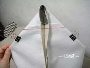 ▼33.先把包包拉链两边抓出三角形整理好,如图,再把穿了龙虾扣的皮子缝在拉链两边: