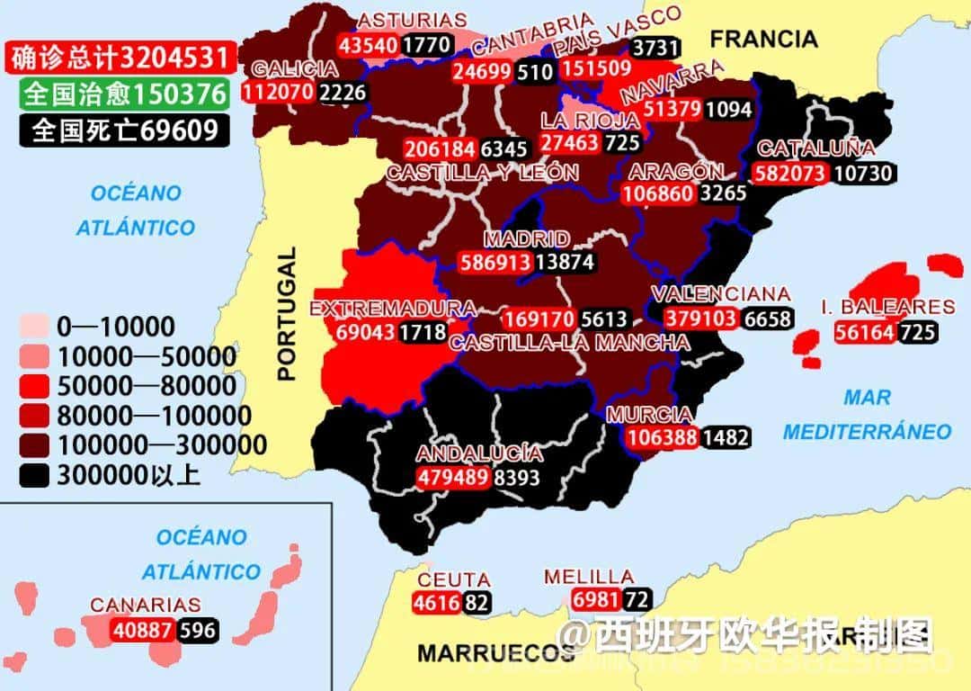 3月1日西班牙24小时内新增1159例确诊患者,马德里(176),卡斯蒂利亚·莱昂(138),阿斯图里亚斯(101),加纳利(96),安达卢西亚(86),瓦伦西亚(79),阿拉贡(64),纳瓦拉(42),坎塔布里亚(39),加利西亚(31),穆尔西亚(26),里奥哈(13),埃斯特雷马杜拉(12),休达(10),梅利亚(5),卡斯蒂利亚拉曼恰(3),加泰罗尼亚(0)。