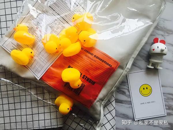 今年的PVC塑料材质也可以跟帆布包配一脸哦,加了一层薄膜的帆布包时尚感就油然而生,里头的小鸭子也是真的配饰哦,一只只洗澡鸭都很软萌。
