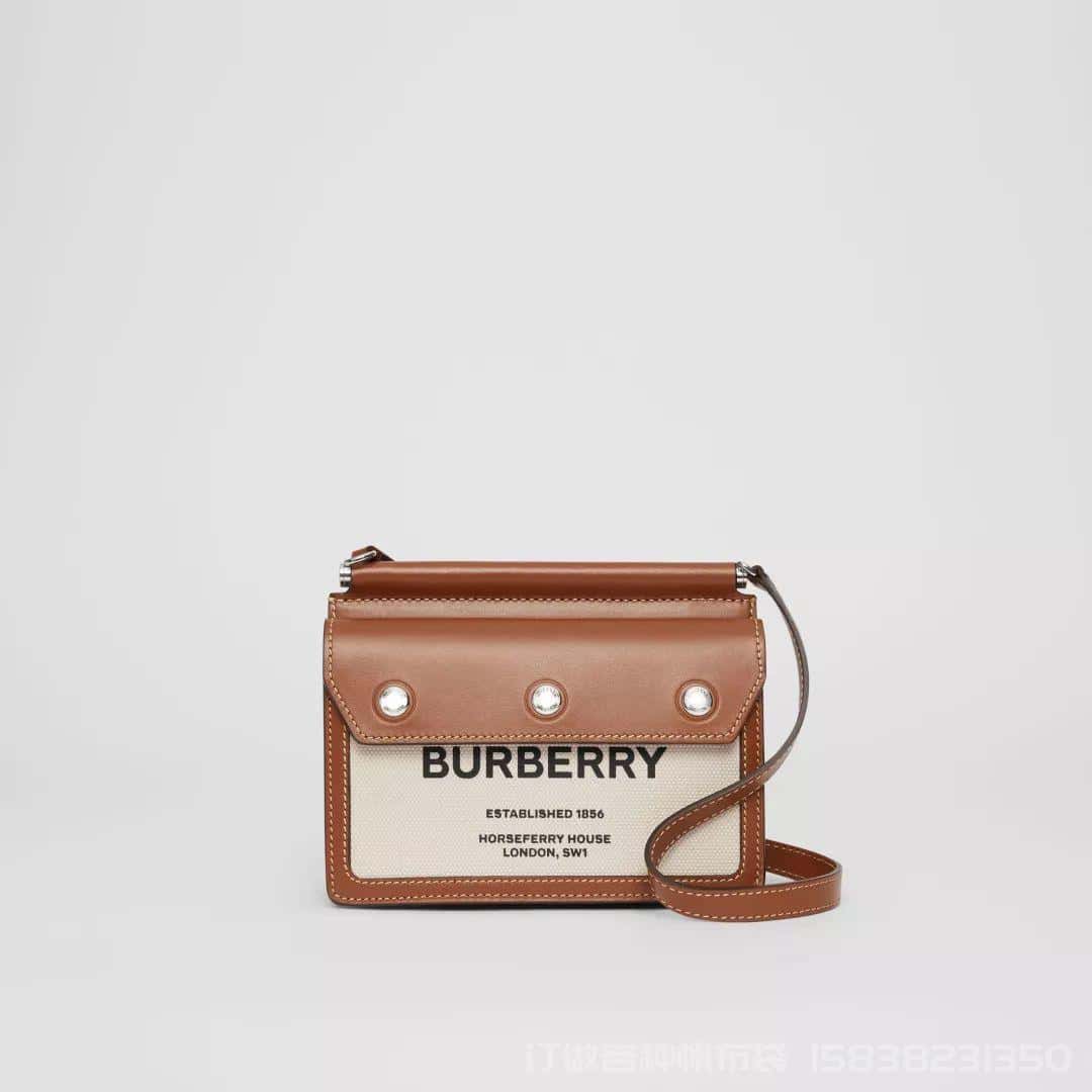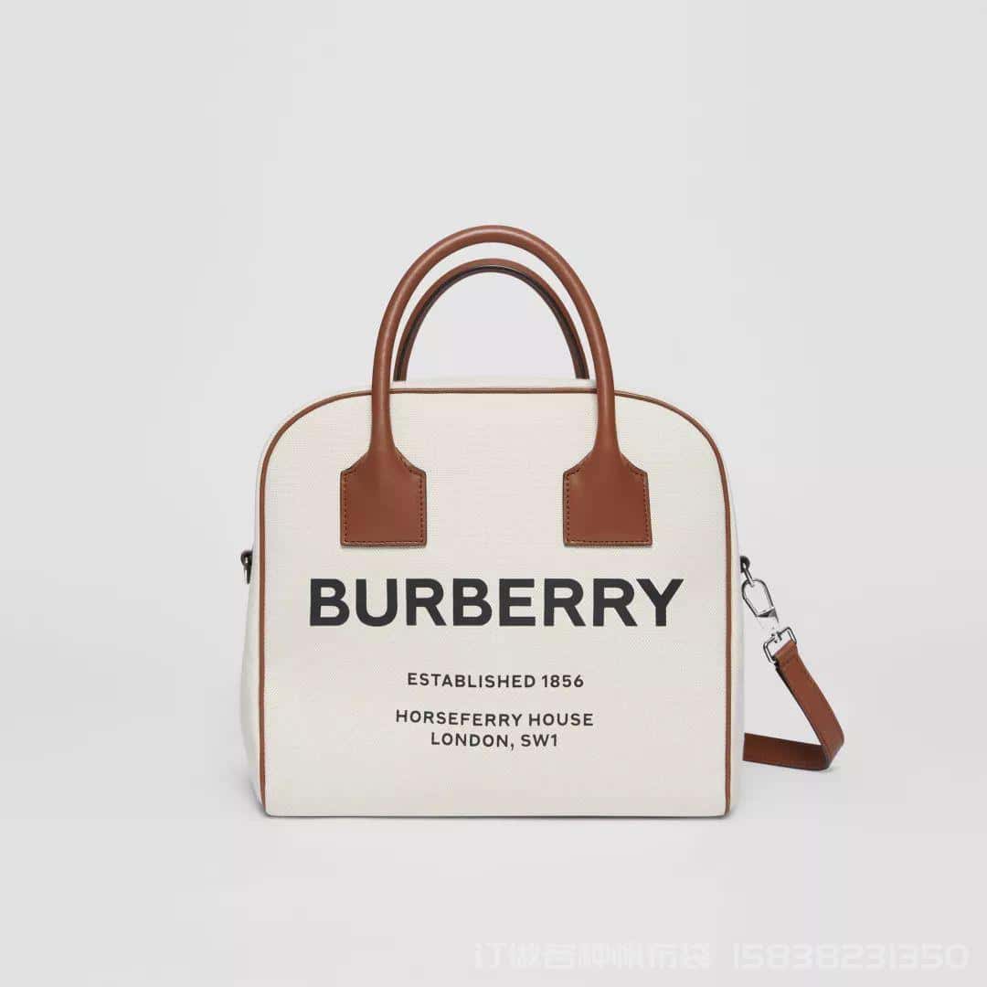 除了纯色的素面款,还有印染了Burberry字样、成立时间及总部地址的Cube、Title Bag、Pocket Bag等。
