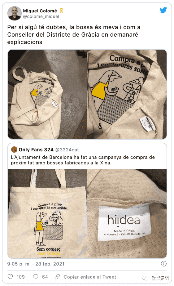 在事情发酵了几个小时后,人们发现这些袋子不仅来自中国,还有些是在印度生产的。除此之外,这些帆布包不仅不在巴塞罗那生产,连销售商都位于马德里。
