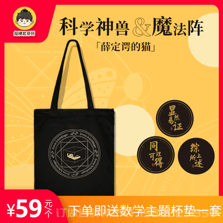 让人人都爱上数理化,是超模君开发数理哲主题的文创产品的初衷。把晦涩的知识点放入生活中,用高深的原理公式装点生活。希望这一款帆布袋也可以给每一个人带来理性之光。现在下单购买的话,还可以享受两大优惠。惊喜优惠一:薛定谔的猫款帆布包立减50元!到手价仅 59元下单还送数学主题杯垫一套