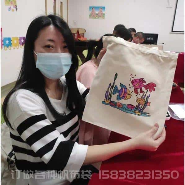 活动中,工作人员为大家发放事先准备好的帆布袋、画笔、颜料以及彩绘图片,孕妈们迫不及待地开始动起手来,在图案上填充上斑斓的色彩。定制自己专属的DIY帆布袋,浓彩重墨的色彩之下传递着孕妈对宝宝的爱。