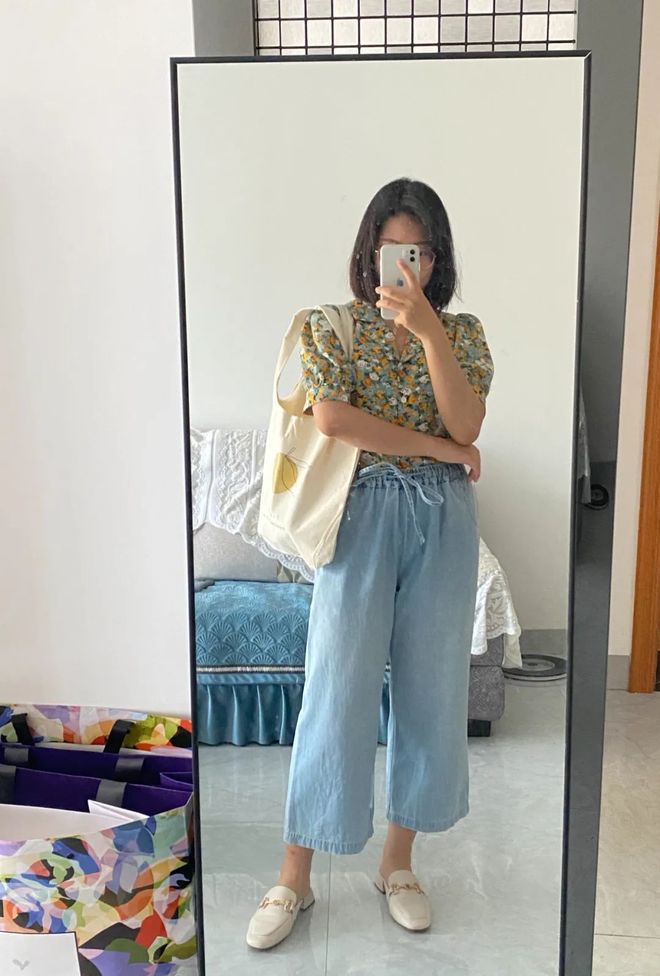 这只就是浅杏色,正面有橘子图案,讨个大“橘”大利的寓意,浅浅迷信一下。它背面没有图案,纯色更好搭配,上身长度对我来说(160cm)也刚好,没有超过我手腕,拿东西很顺手。