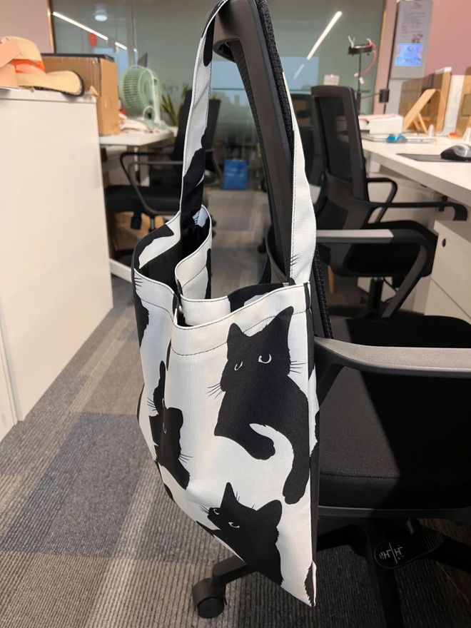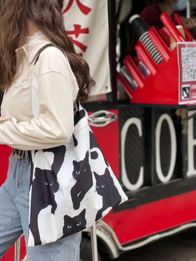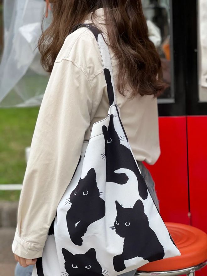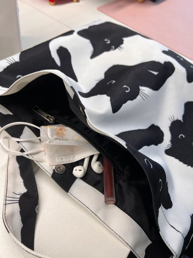 之前常背的那只用久了脏了旧了,就入手了只新的。首先是看中了它黑白配色很百搭,另外上面还有我很喜欢的猫咪图案,当时一看到就很是心动。 不过好多人说远看像奶牛哈哈哈,近看才发现是猫咪 。