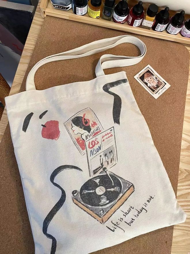 当时给这款帆布袋设计的时候,加入了黑胶唱片、留声机、丝带、红果子等元素,目的是希望能表达对生活的热爱,想给人一种轻松的情绪氛围~