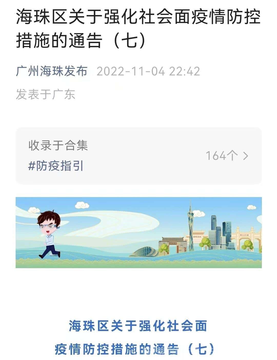 据广州海珠发布微信号消息,11月4日晚,广州市海珠区新型冠状病毒肺炎疫情防控指挥部办公室发布通告,为有效阻断疫情传播扩散风险,尽快实现社会面动态清零,切实保障广大人民群众生命安全和身体健康,经研判,决定11月5日0时至11月7日24时,在海珠区全域实行如下防控措施: