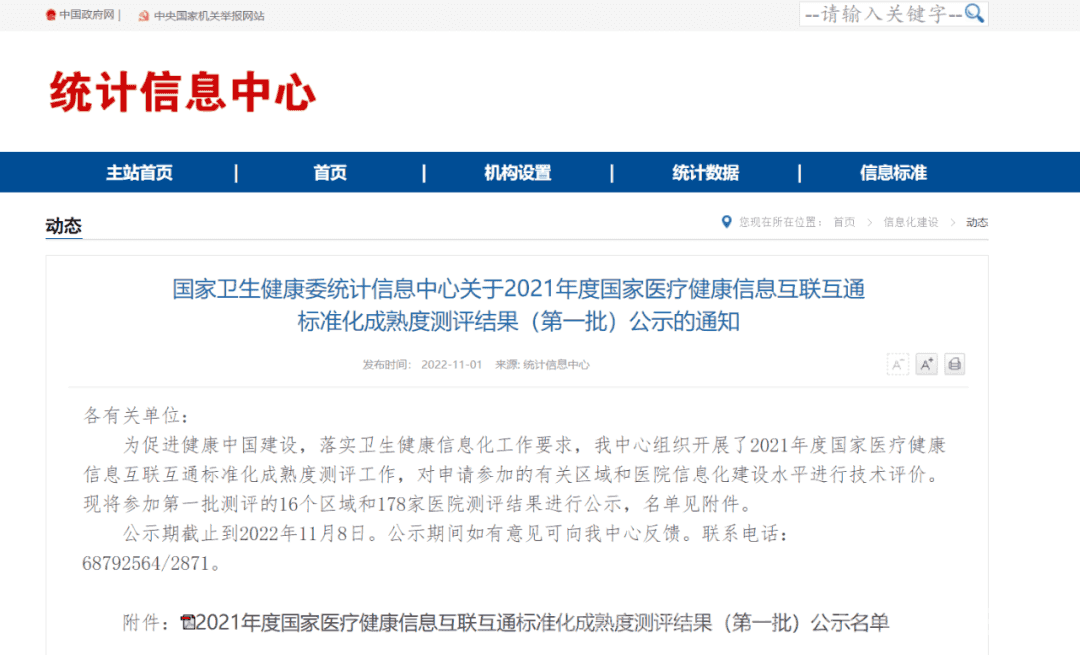 11月1日,国家卫生健康委统计信息中心公示第一批2021年度国家医疗健康信息互联互通标准化成熟度测评结果,本批次测评共计16个区域和178家医院参加。178家医院当中,150家医院测评结果为四级甲等,22家医院测评结果为四级乙等,6家医院测评结果为三级。