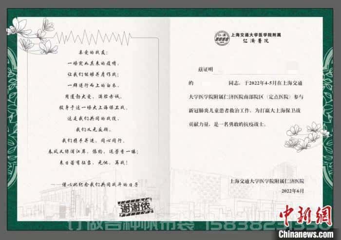 中新网上海6月3日电 (记者 陈静)记者3日获悉,上海交通大学医学院附属仁济医院南部院区(下称:仁济南院)定点医院儿科病区正式休舱。仁济南院定点医院为每位儿科医疗队队员准备了纪念礼物:一份抗疫工作证明、精心设计的帆布袋和绘有医务人员卡通形象的旗帜。