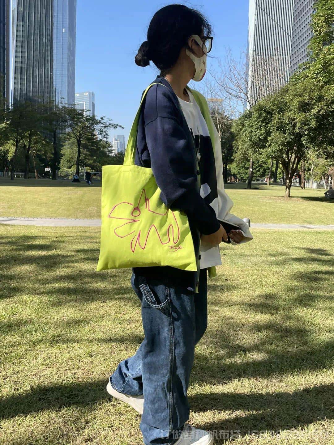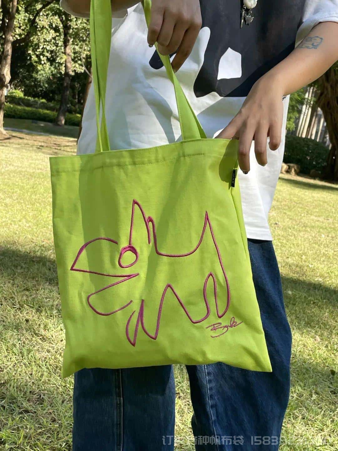 衣柜里的搭配,不能缺少一个鲜艳的帆布袋。粉色刺绣小包,让简单的搭配更出挑。