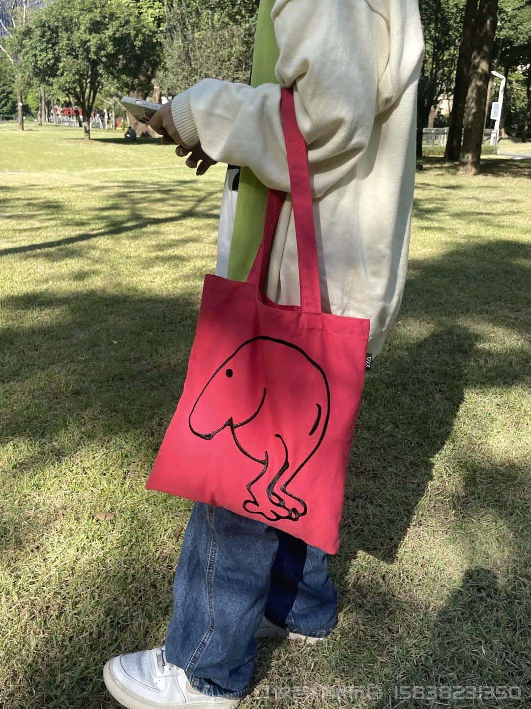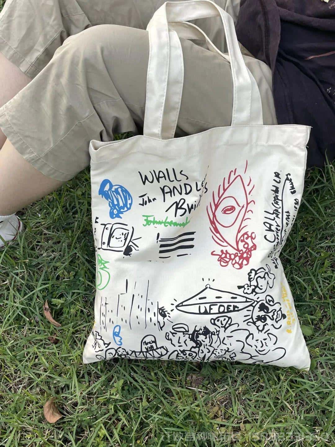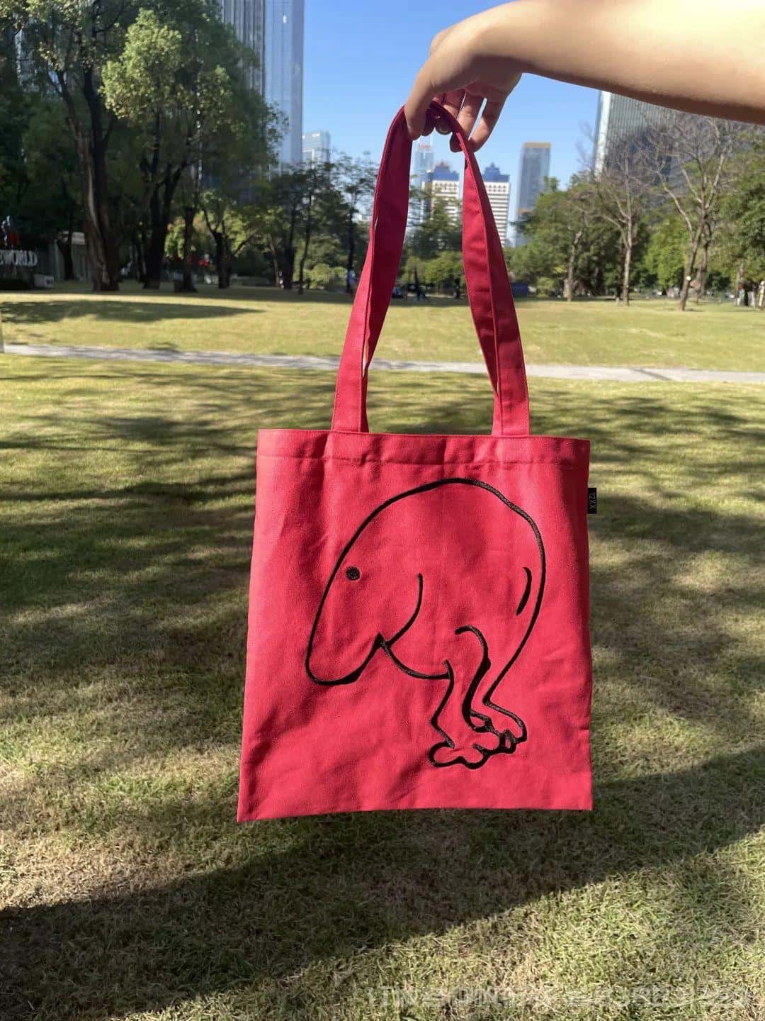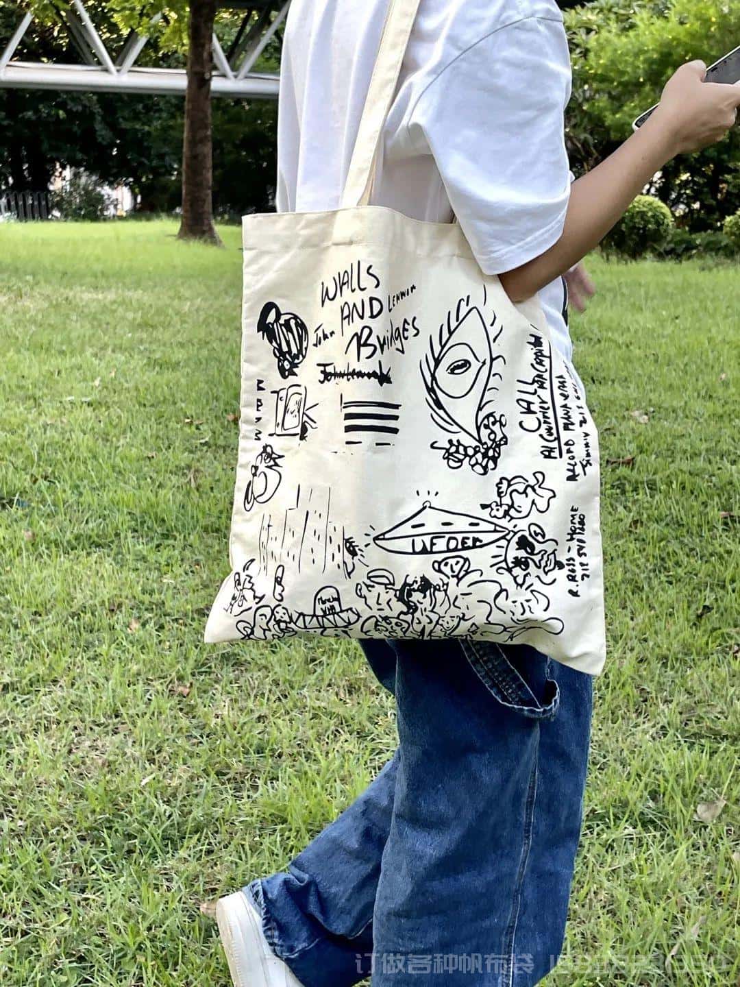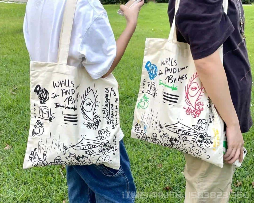 设计来源于列侬手稿。红色的字体设计使得白色帆布袋稍显跳脱一点。以上两款包包,点击下边小程序即可购买