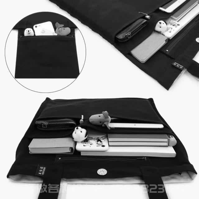 其实帆布包有个通病,那就是容量很大,同样也有个坏处,那就是大杂烩一样,所有东西都堆在一起,要找一样小东西的时候经常手忙脚乱。这款帆布包的内部设计就解决的这个问题,它内部有大中小三个SIZE的口袋,方便大家随意摆动物品。