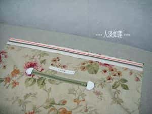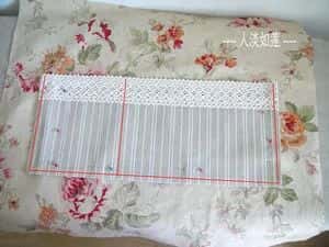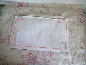 ▼10.拿做内贴袋的棉布38*18cm一片,把它缝在另外一片里布上:如图红色线,中间压线,变成一大一小两个贴袋: