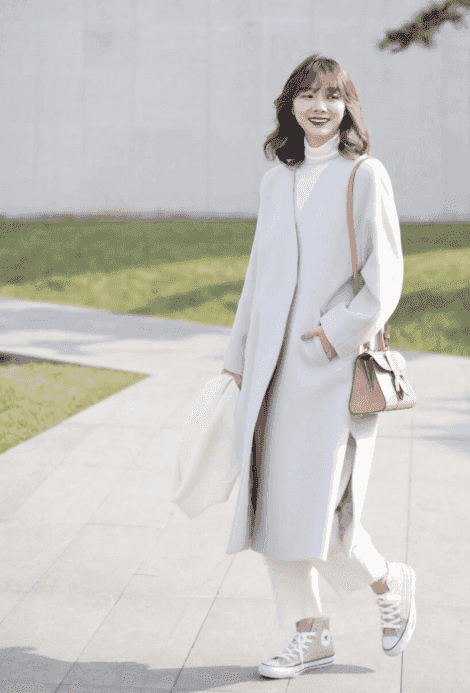 灰色大衣下半身搭配小白裤,白色的阔腿裤很清爽, 和深灰色形成了色彩的对比,再加上帆布鞋搭配起来,看着时髦潇洒,休闲感十足,基本上不会出错,日常搭配都是很ok的。