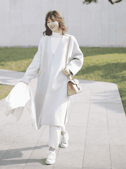 上半身搭配的白色大衣也很温柔,大衣结合白色的内搭,同色系穿搭很显气质,显白的效果也不错,下半身搭配的白色九分裤更是能够和大衣色彩呼应起来,起到显高的目的。