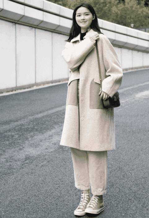 燕麦色的大衣搭配同色系的直筒裤,再加上同色系的帆布鞋修饰,看着并不会显老,反倒是让整体的搭配风格呼应起来,简单大气,很适合减龄需求强烈的妹妹。