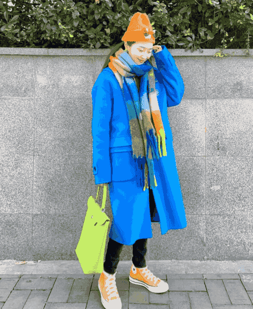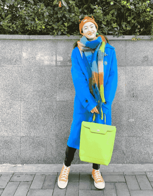黑白灰的帆布鞋都是较为基础的,百搭耐看,但是针对追求时髦的姐妹来说,亮色系的帆布鞋也是更值得入手的哦。下面的博主选择黄色帆布鞋,减龄效果十分明显,搭配蓝色的大衣,更是形成了色彩的碰撞, 活力满满。
