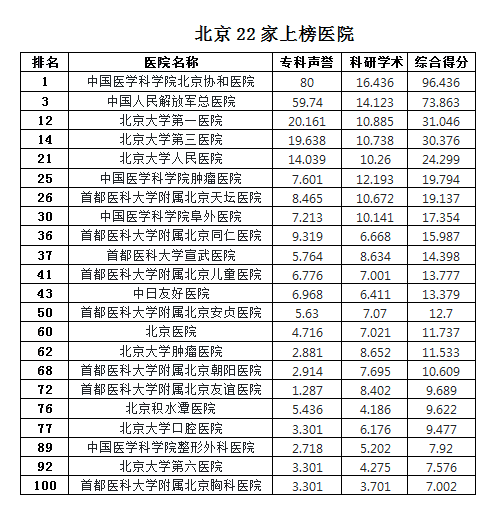 综合排行榜的分数主要分为声誉得分、科研学术和综合得分三项。排行第一位的北京协和医院专科声誉达到80分,为所有上榜医院中最高的,领先第二名四川大学华西医院超10分之多,综合得分96.436分。