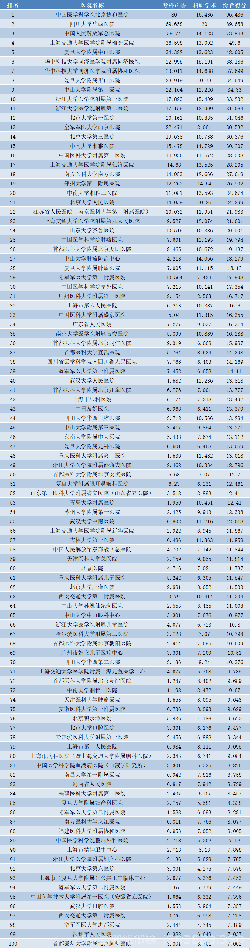 综合排名:北京协和医院、
