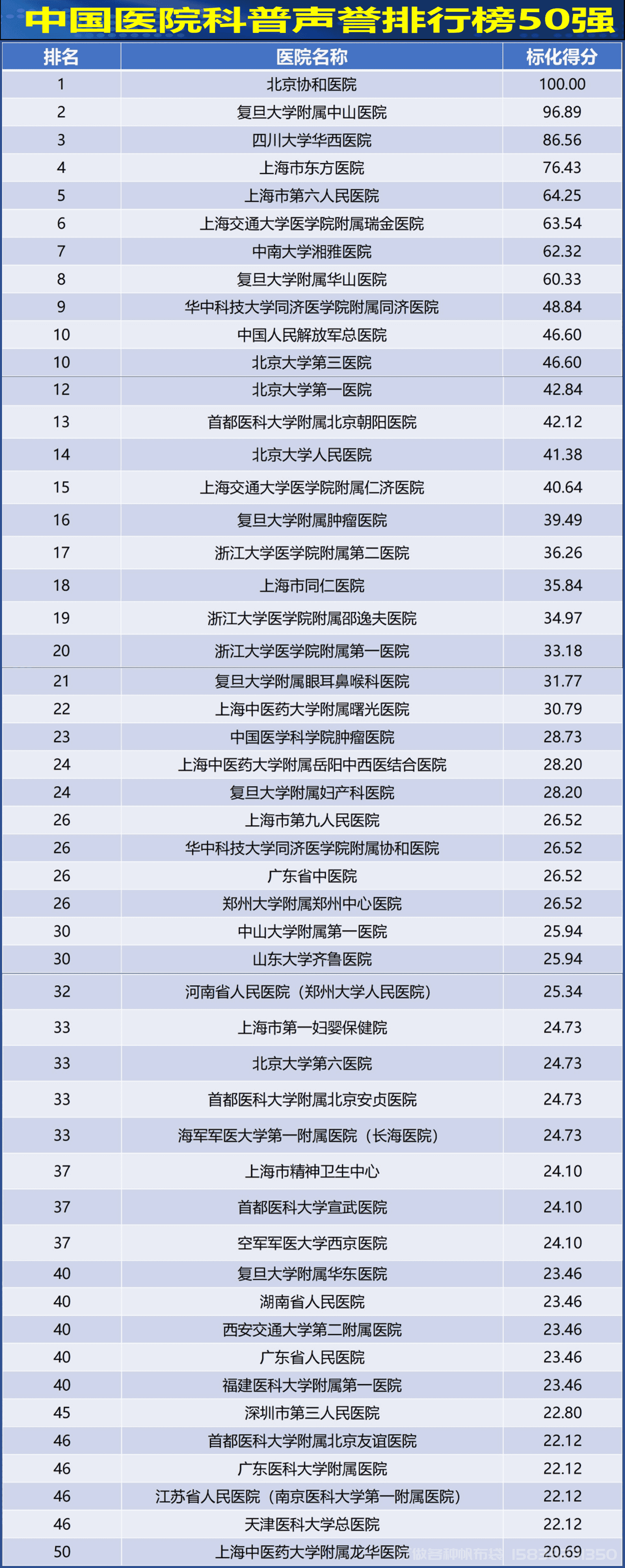 据介绍,报告盘点出了国内科普声誉最杰出的医疗机构50家,北京协和医院、复旦大学附属中山医院、四川大学华西医院成为科普声誉最佳的三家医疗机构。