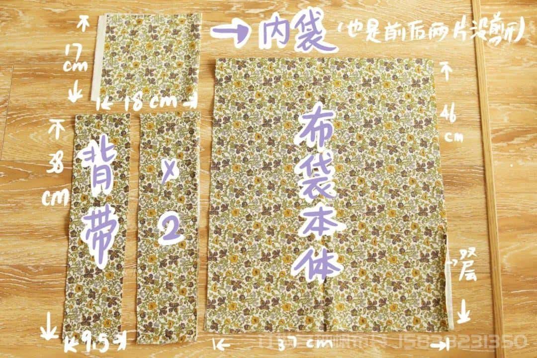 裁剪完成后,你会得到三部分:1⃣️袋子的主体、2⃣️两层带子、3⃣️内袋。