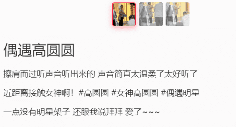 在节目录制当天,更有幸运网友在特产店铺偶遇高圆圆,她跟身边的店铺老板交流,因为比老板身高更高,高圆圆还侧过身子低头听对方讲话,看上去好有礼貌。在去年,更有路人偶遇高圆圆狂奔。只见她穿着牛仔裤和针织衫,身边只跟了一位助理,或许是红灯快到了,她努力奔跑,头发也飞扬起来。