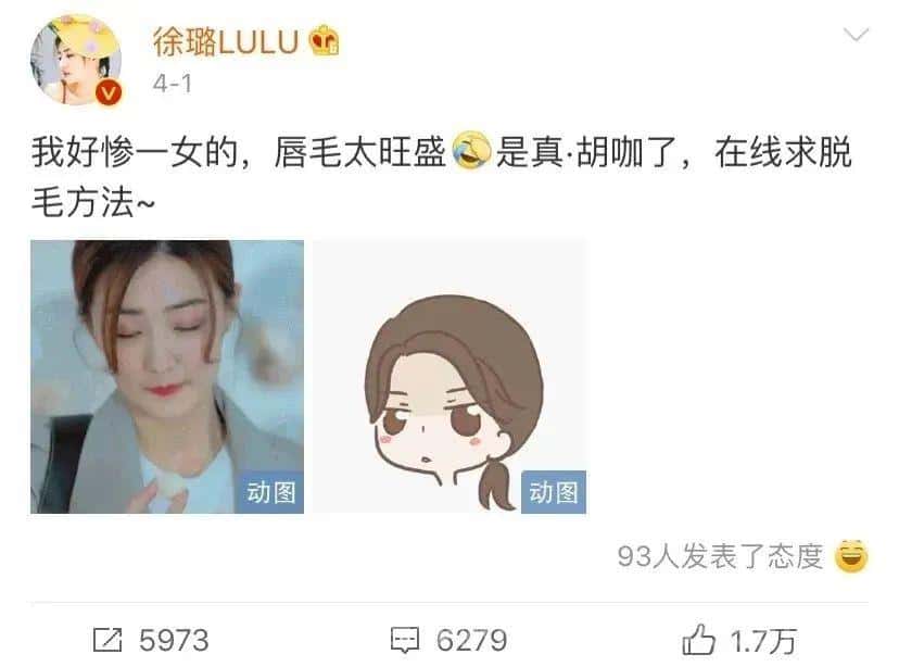 虽说体毛自由,but哪个女孩子不希望自己身上可以白嫩嫩,滑溜溜的呢?为此,徐璐不仅直播在线刮腿毛。 甚至还在微博上自嘲为“胡咖”,向广大网友求教脱毛方法。