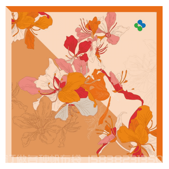 十周年丝巾以橙红色为主色调,以优雅、柔美的线条勾勒出一朵朵紫荆花,互相搭配的色块填充了花瓣,让花朵充盈舒展,寓意港大深圳医院蓬勃生气、锐意进取。方巾对角的斜线划分丝巾底色,互相搭配的深浅两色,述说深港两地独特的地缘特色,从视觉上呈现紧密的深港医疗合作。