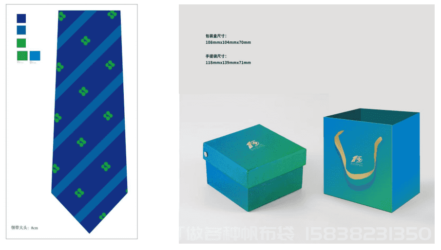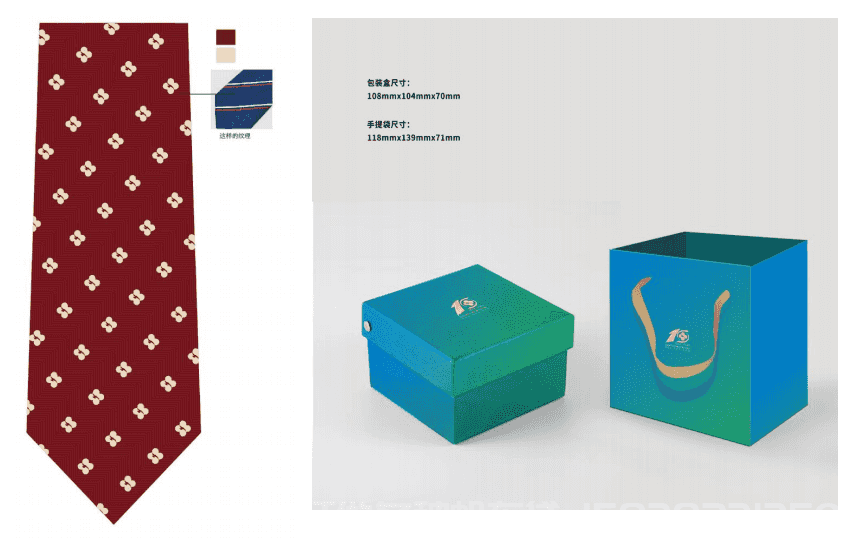 十周年领带有蓝、红两款。蓝款领带运用医院Logo色调,以沉稳深蓝色为底色,搭配天空蓝的条纹,在一片片海蓝间点缀着绿色的医院徽标,寓意医院所秉承的绿色医疗理念。红款领带用温暖的深红色为主色调,搭配淡黄色的医院标识,代表医疗团队永葆炽热的赤诚之心。