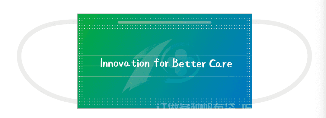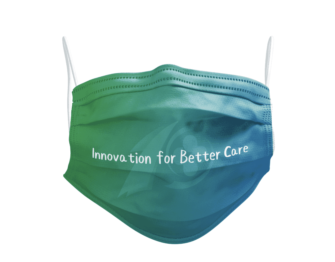 十周年口罩大面积印染蓝绿渐变色,佩戴效果令人眼前一亮!十周年Logo设计为暗纹出现在口罩背景处,正中央以轻快的字体书写医院英文版slogo:Innovation for Better Care。