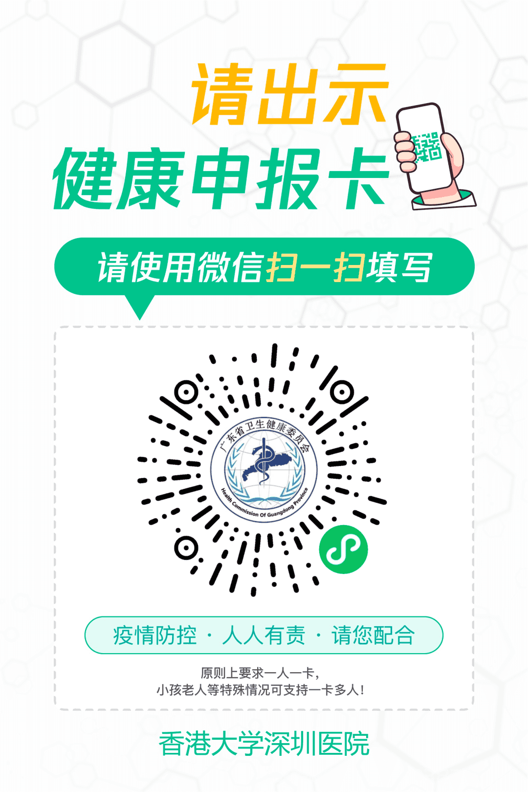 根据广东省卫生健康委最新防疫要求为节省您的时间您可在就诊当日提前扫码【粤健通】小程序并完成健康申报卡信息录入方可入院就诊申报卡24小时内有效