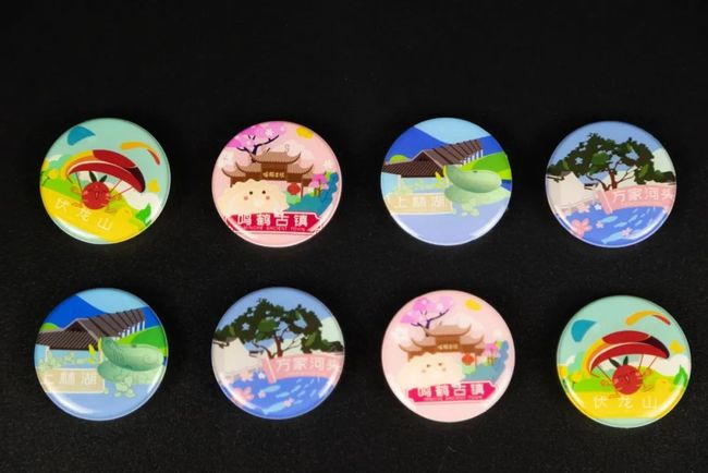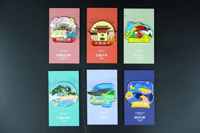慈溪值得留恋的风景太多,在多次取舍后,最终我们选取了鸣鹤古镇、方家河头、五磊寺、伏龙山、上林湖、明月湖等六个点作为慈溪风情系列文创的原型,由此开发了创意金属冰箱贴、气囊手机支架、ABS奇趣卡套。