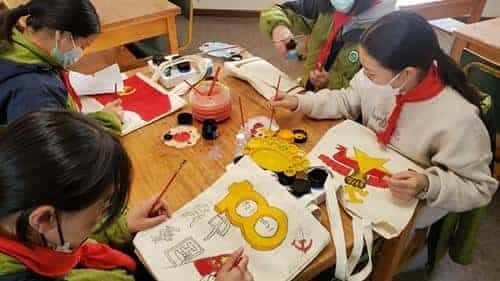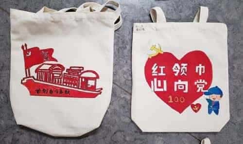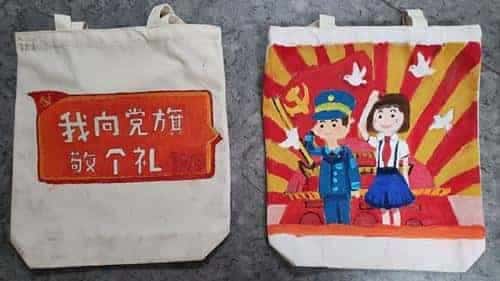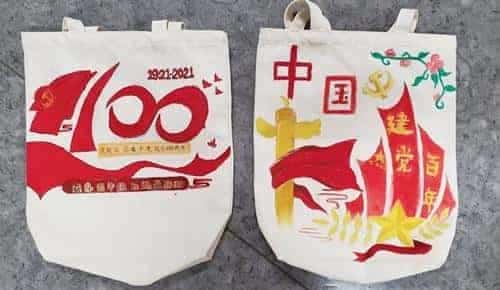 本次活动要求学生结合课堂上学习的党史精神,利用画笔描绘出对党史的理解,表达对党的深厚情感。首先,各班美术老师向学生们介绍了帆布袋的绘画方式,并对每一个步骤和注意事项进行讲解。随后,学生们跃跃欲试,用事先准备好的颜料和画笔,进行认真创作。红船精神、我向党旗敬个礼、红领巾心向党等精美的图文,点缀着白色的帆布袋,体现着学生们对建党百年的真挚情感。
