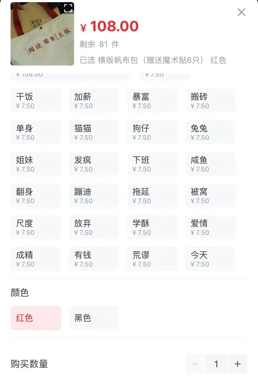 其余魔术贴需单独购买:躺着、干饭、加薪、暴富、搬砖、单身、猫猫、狗崽、兔兔、姐妹、发疯、下班、咸鱼、翻身、蹦迪、拖延、被窝、尺度、放弃、学酥、荒谬、今天、爱情、成精、有钱