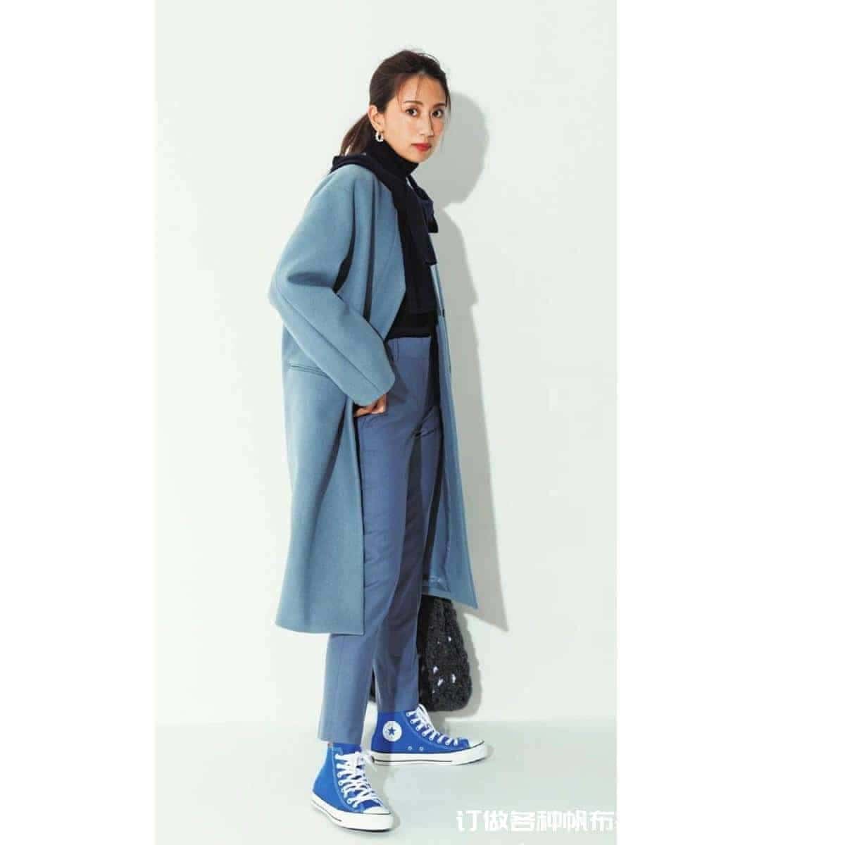 在大衣的色彩应用上和帆布鞋的颜色选取上,则没有太多的框框架架需要遵守。以长款的黑色大衣为例子,可以搭配白色阔腿裤和白色帆布鞋,这样的着装最是干净,同时也不会因为外套的黑色大衣过分老气而导致女性的外形年龄增加。无论到了多大的年纪,这样的搭配公式永远流行。