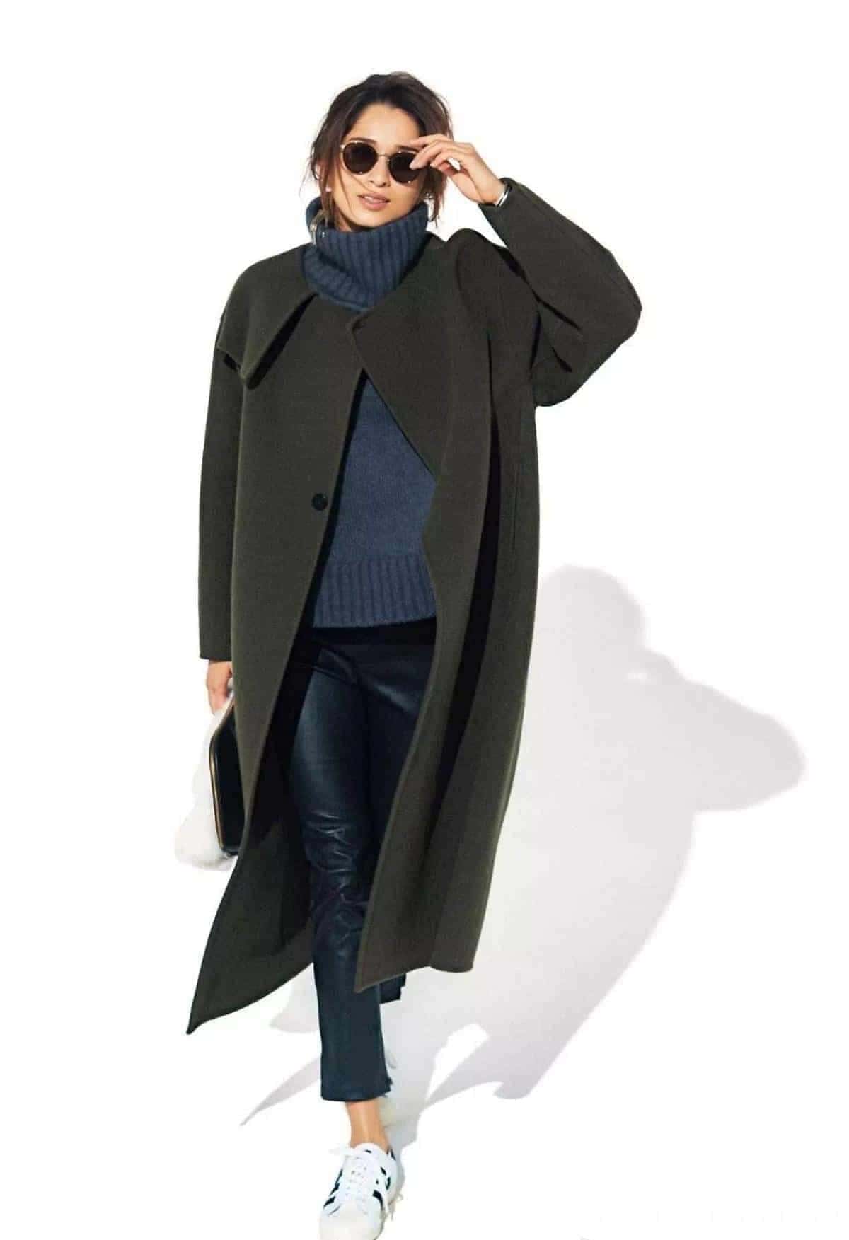 像这套穿搭,也采用的是阔腿裤和帆布鞋的组合,可以呈现出一种干净利落的画风,尤其是配合了短款设计的大衣时,可以利用裤装来实现对身材的调整和润色作用。