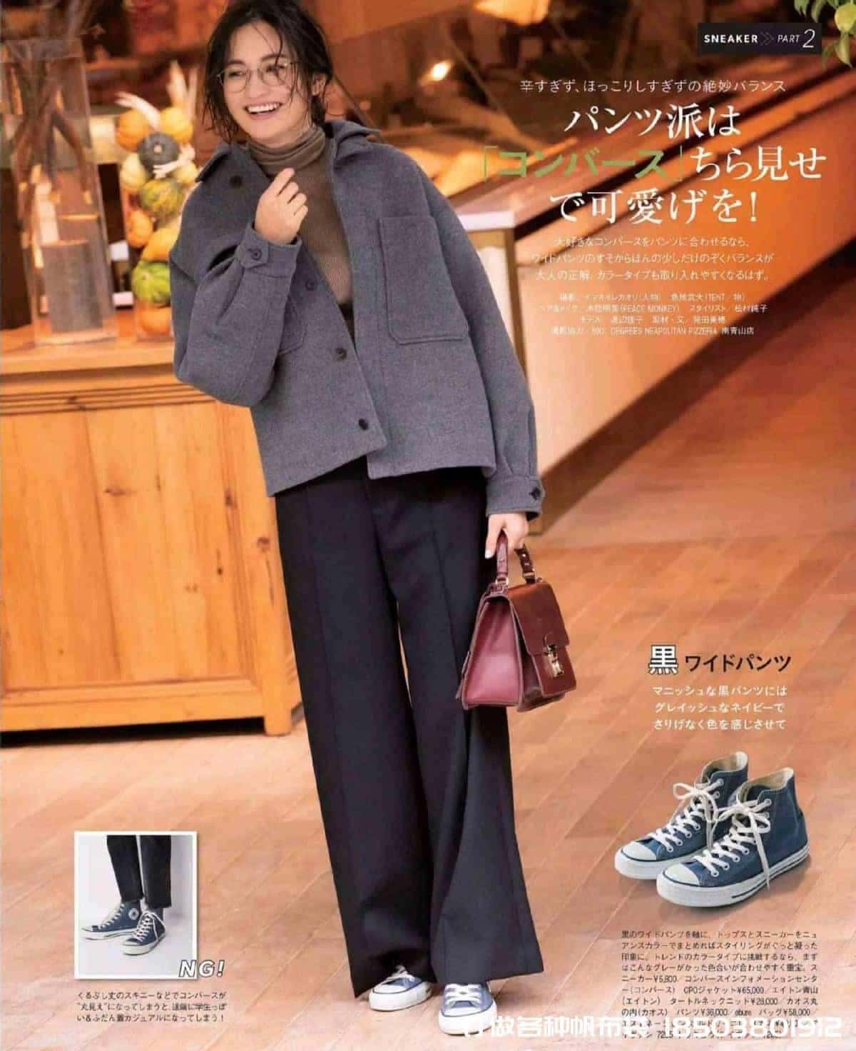以这款白色帆布鞋为例,可以搭配宽松一点的阔腿长裤,而且裤装的颜色可以很浅,也可以很鲜艳,完全不具备任何的挑战性,驾驭这种鞋子最为减龄。